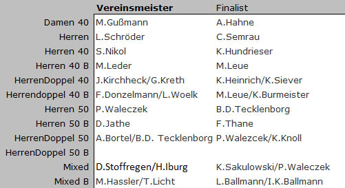 Mixed-Vereinsmeister wurden schließlich D.Stoffregen/H.Iburg mit einem 6:2/6:4 über K.Sakulowki/P.Waleczek.